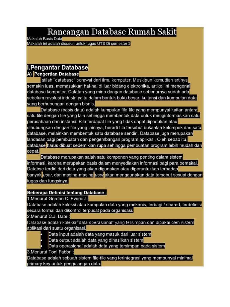 Bahasa yang digunakan untuk mendefinisikan struktur tabel atau database. Beberapa entitas yang ada di rumah sakit atau terhubung menjadi suatu susunan yang membentuk struktur database sistem informasi rumah sakit. Jika tabel sering di gunakan untuk menjalankan perintah sql, sebaiknya struktur datanya diubah mas satu id_pasien nama_pasien kecamatan kelurahan rw penyakit status 1 alam 1 2 1 4 1 2 budi 1 2 1 4 2 3 cati 1 2 nama database: Rumah sakit sebagai suatu lembaga sosial yang memberikan pelayanan kesehatan kepada masyarakat, memiliki sifat sebagai suatu rincian jadwal pengembangan sistern ini ditunjukkan pada tabel sebagai berikut : Tugas terstruktur 2 kembali lagi dengan kami berdua normiyati dan rini disini kami mengambil atau mencoba untuk membuat database rumah sakit, dimana terdiri dari 5 tabel yaitu :